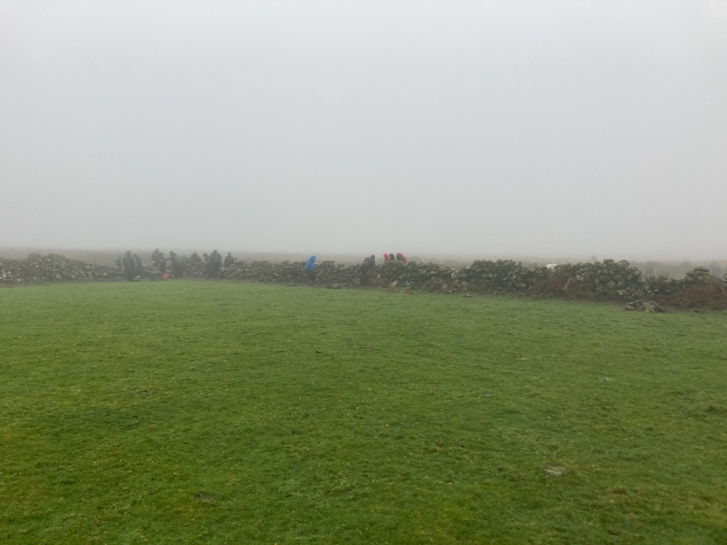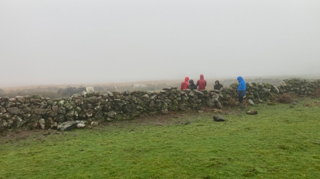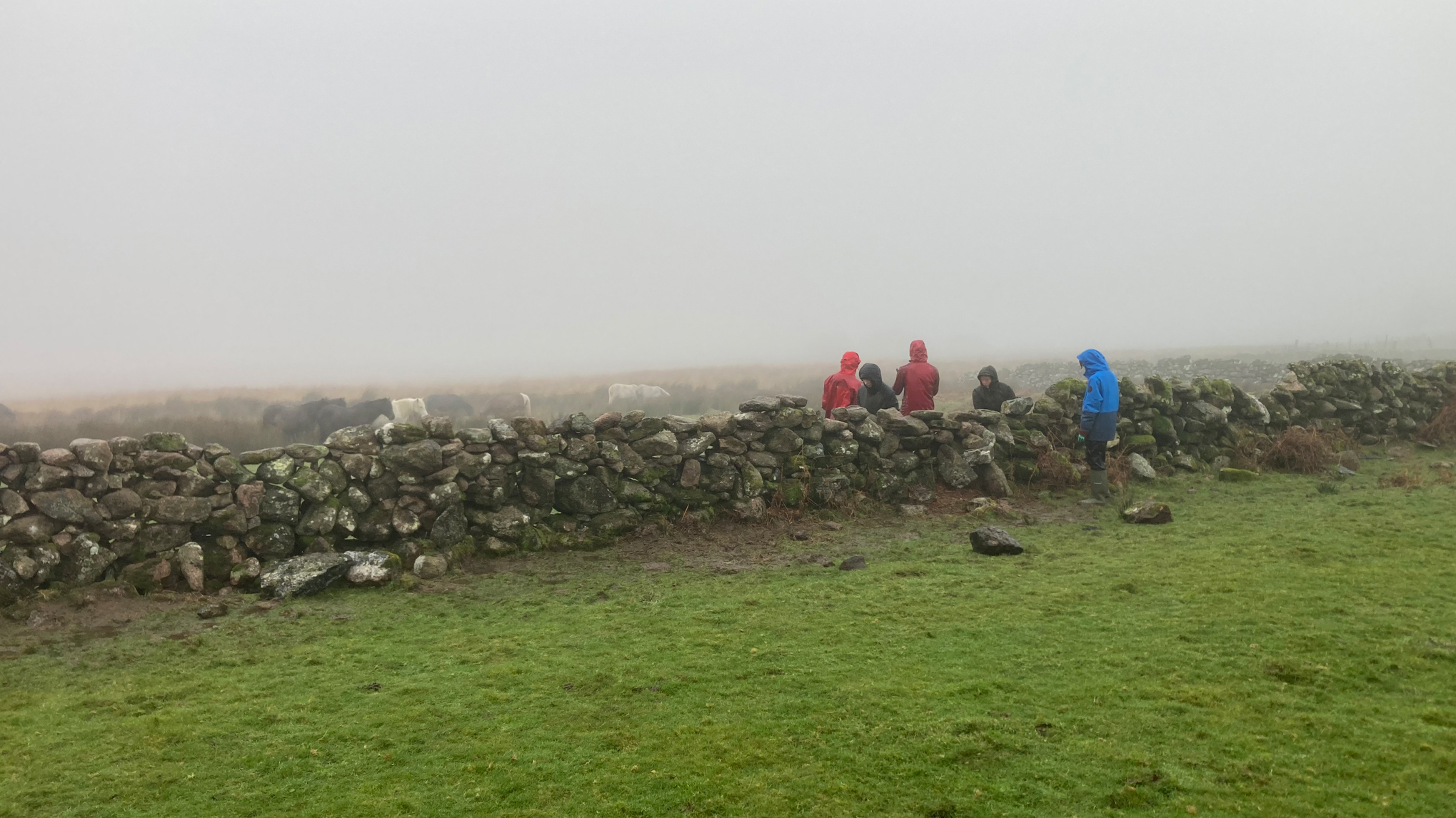 The second day, however, the heavens opened and the rain came at us with a vengeance! Stones were wet, faces were wet, fingers were wet and all the animals on the common stood with their backs to the rain. There was not a dry eye, glove or sock in the group and yet with their teacher Martyn and fantastic DYR leader Kat the group persisted with enthusiasm. Having to take extra caution due to the now slippery nature of the task in hand this group were able to achieve brilliant repairs to the wall. A much needed break in the Old Peat house and Kat’s warm hot chocolate gave restbite before completing their sections of wall in the afternoon.